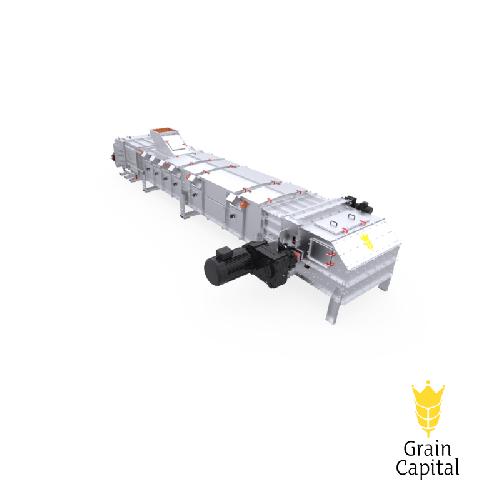 - Короб та натяжна станція оснащені самозачищувальним барабаном, що повертає розсипаний матеріал на транспортну стрічку.